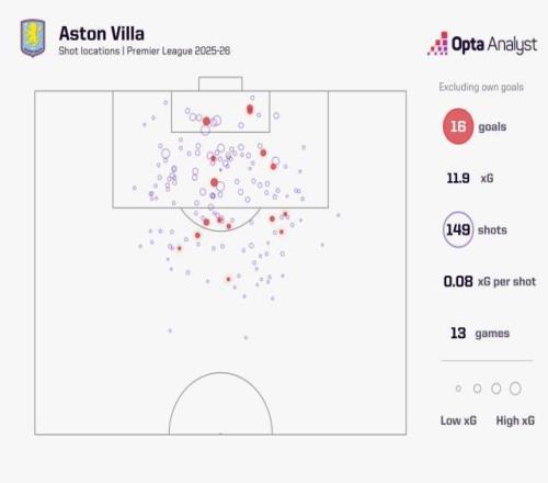 然而,埃梅里和他的球队似乎对预期进球值“嗤之以鼻”。截至英超第13轮,维拉总共打进16球,只能排到第13位,预期进球则是11.88,仅好于升班马伯恩利(9.69),排名倒数第二。而且他们所有射门的平均预期进球数(0.08)也是英超20支球队中最低的,这意味着维拉并没有经常创造出高预期值的射门机会。