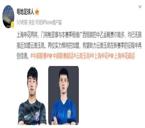 而且现在看来,云南玉昆的引援脚步并未停止,据知名博主“粤地足球人”透露,上海申花有两名球员无限接近加盟云南玉昆,他们分别是门将鲍亚雄和前锋费尔南多,值得注意的是,鲍亚雄本赛季因为伤病问题,被薛庆浩抢去了首发位置,而费尔南多本赛季则是被上海申花外租至中乙球队广西恒宸,该球员本赛季打进24球的同时,还荣获中乙金靴和中乙最佳球员。